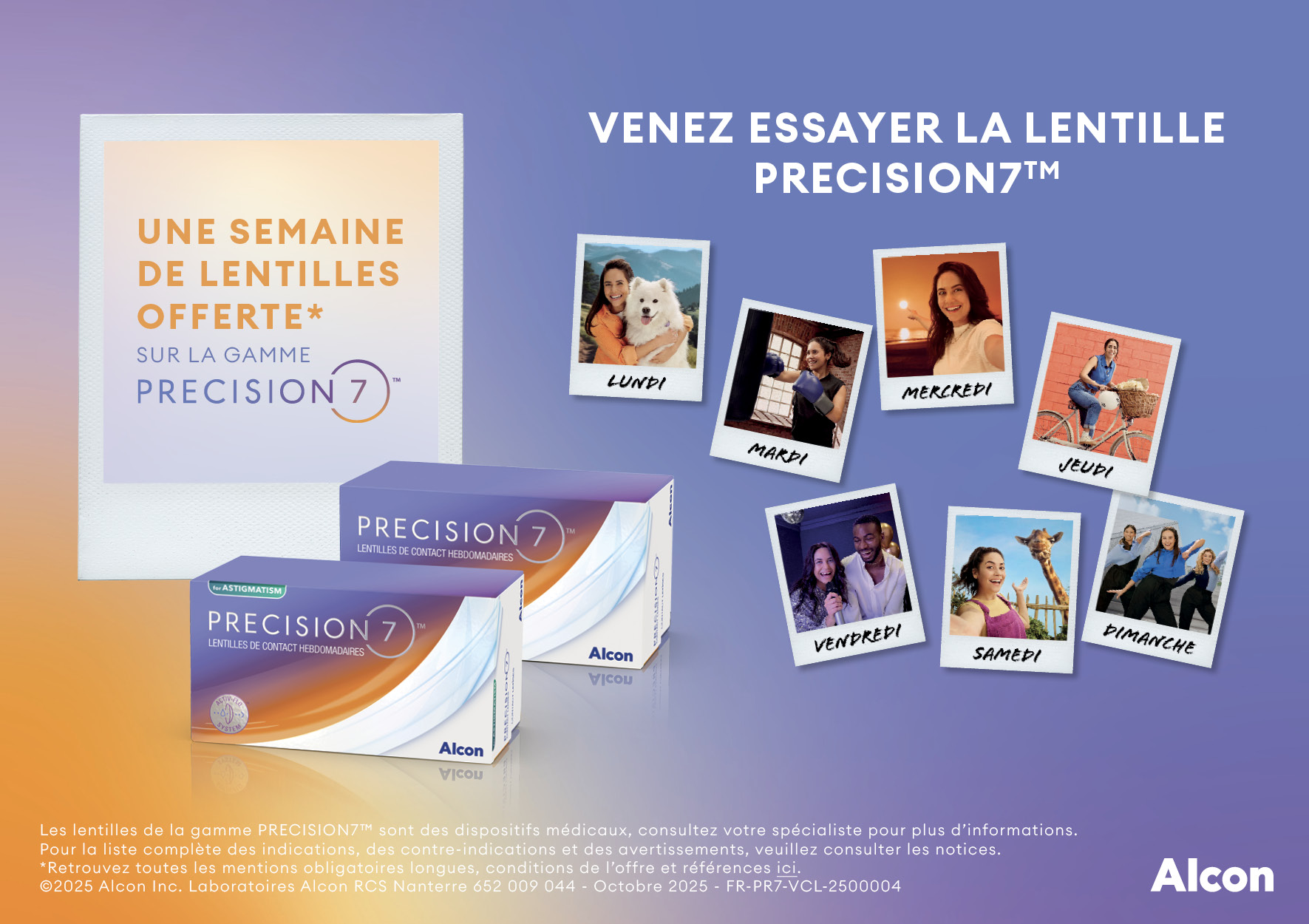 Les lentilles de contact souples de la gamme PRECISION7 (PRECISION7 , PRECISION7 for ASTIGMATISM) sont indiquées pour la correction optique des amétropies réfractives (myopie ou hypermétropie) chez des personnes ayant des yeux sains avec un astigmatisme minime ne gênant pas leur acuité visuelle ou nécessitant une correction additionnelle pour l'astigmatisme. Les lentilles hebdomadaires de port journalier nécessitent un entretien approprié chaque soir et doivent être renouvelées toutes les semaines. L’entretien correct des lentilles et le renouvellement régulier de l'étui-lentilles sont essentiels. Veuillez lire attentivement les instructions figurant dans la notice et sur l’étiquetage. Pour la liste complète des indications, des contre-indications et des avertissements, veuillez consulter la notice. Le port de lentilles de contact est possible sous réserve de non contre-indication médicale au port de lentilles. En cas de doute, demandez conseil à votre spécialiste. Ces dispositifs médicaux sont des produits de santé réglementés qui portent, au titre de cette réglementation, le marquage CE. Fabricant : Alcon Laboratories Inc. Conformément à la réglementation en vigueur, une ordonnance médicale de moins d’un an est nécessaire pour la délivrance de lentilles de contact correctrices à un primoporteur.©2025 Alcon Inc. Laboratoires Alcon RCS Nanterre 652 009 044 – Octobre 2025 - FR-PR7- VCL-2500004