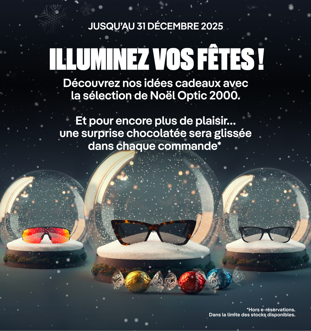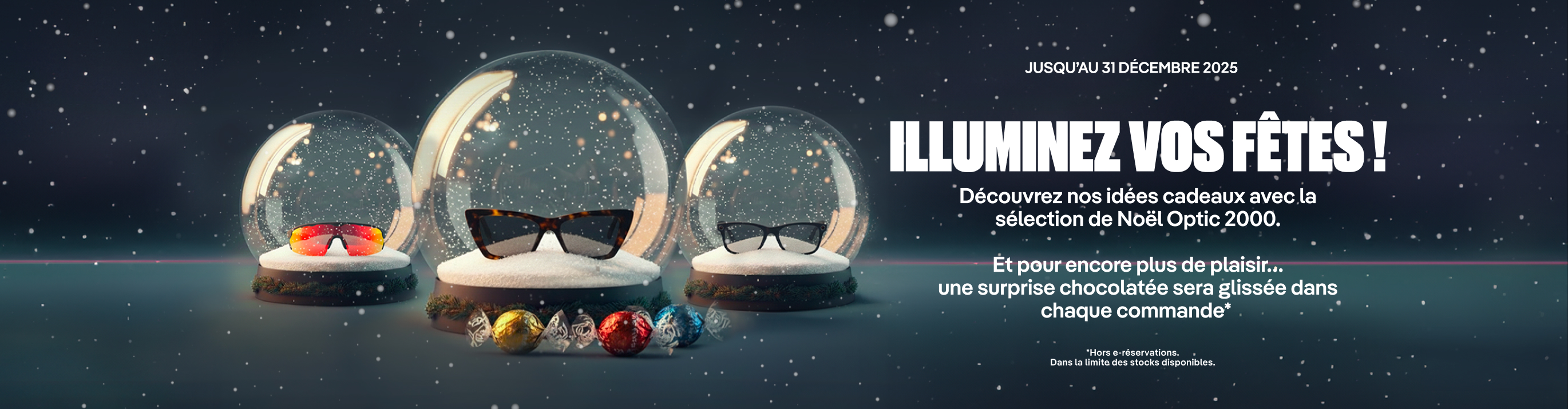 Pour prolonger la magie des fêtes, Optic 2000 glisse une surprise chocolatée dans chaque commande passée en ligne jusqu'au 31 décembre.*Un geste gourmand pour vous remercier de votre confiance.Offre valable sur toutes les commandes en ligne, hors e-réservations en magasin.